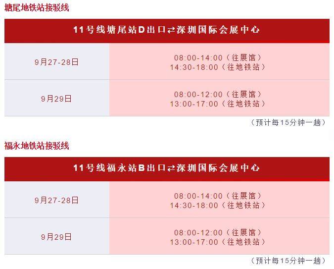 為便于廣大展商和觀眾出行,主辦方于展會期間在以下指定地點和時段提供免費巴士接駁服務: