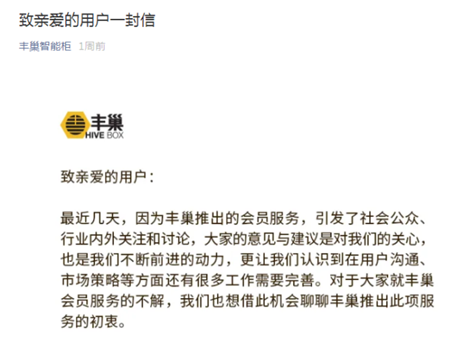 4月30日,豐巢正式上線會員服務(wù)功能實行收費,一石激起千層浪,經(jīng)過被抵制,發(fā)布公開信解釋,用戶不買賬,再被約談,5月15日豐巢科技公司道歉并修改服務(wù),這場沸沸揚揚的收費事件才暫告一段落。