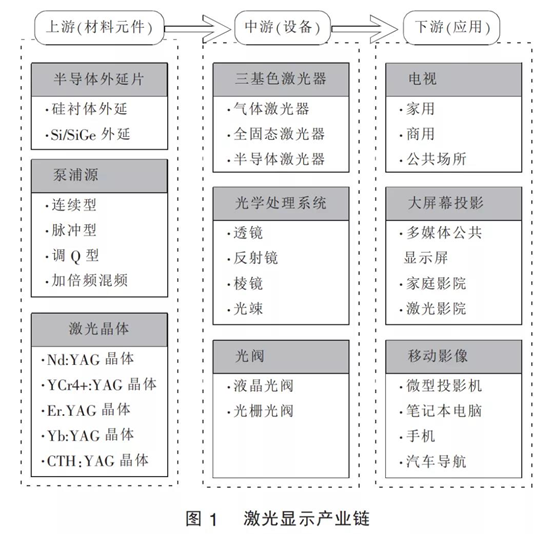 激光顯示產(chǎn)業(yè)上游包括半導體外延片、泵浦源和人工晶體等;中游包括半導體激光器、全固態(tài)激光器、光學成像器件、光學引擎及驅動電路、信號處理電路和屏幕等;顯示設備集成商最后完成激光顯示設備的集成和市場銷售。其產(chǎn)業(yè)鏈如圖1所示。