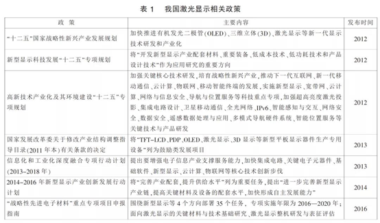 我國非常重視激光顯示產(chǎn)業(yè)的發(fā)展,從中央到地方始終給予極大的關注和支持。早在2012年發(fā)布的《新型顯示科技發(fā)展“十二五”專項規(guī)劃》中,就針對我國激光顯示產(chǎn)業(yè)的發(fā)展提出了明確的目標:年產(chǎn)值達100億元,影院系統(tǒng)占有率達30%。2016 年科技部發(fā)布國家重點研發(fā)計劃首批重點專項 2016 年度項目申報指南,其中,激光顯示入圍“戰(zhàn)略性先進電子材料”重點專項指南,標志著國家已聚焦新型顯示技術和產(chǎn)業(yè)制高點, 抓住我國顯示產(chǎn)業(yè)“換道超車”的發(fā)展機遇,積極開展激光顯示關鍵技術研發(fā)與產(chǎn)業(yè)布局。近年來我國激光顯示相關政策具體如表 1 所示。