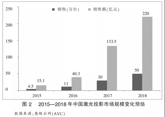 自2014年下半年起,激光投影市場已初步形成規(guī)模,2015年取得爆發(fā)式增長, 銷額規(guī)模同比增長高達532%。世界知名投影廠商紛紛推出基于自己品牌的激光投影產(chǎn)品,2015年總計銷售額15.1億元,銷售激光投影產(chǎn)品4.5萬臺。2016年,激光投影技術逐步為行業(yè)所接受,市場銷量規(guī)模超過11萬臺,銷額規(guī)模達40.3億元,保持了持續(xù)增長的趨勢。2017年,以激光光源為首的新光源投影機得到市場進一步的認可,市場銷量預計將突破30萬臺,同比增長將近200%,激光投影機占據(jù)投影市場全年整體銷量近 14%的份額, 市場普及速度在進一步加速。