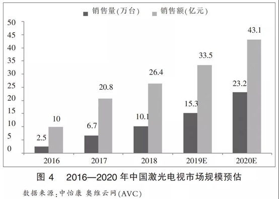 2016 年激光電視市場規(guī)模銷量僅 2.5 萬臺, 銷售額只有10 億元。2017 年,隨著激光顯示技術在業(yè)界受認可程度的提升,越來越多的激光電視產(chǎn)品孕育而生,且銷量呈現(xiàn)井噴式增長。2017 年激光電視市場規(guī)模銷量6.7萬臺,銷售額 20.8 億,增長率分別是168%及108%。