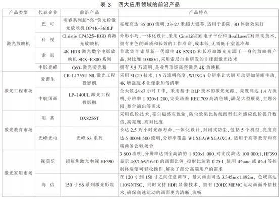 從產(chǎn)品層面看,投影儀、電視、頭盔顯示器、多媒體公共顯示屏、大屏幕指揮系統(tǒng)、數(shù)字電影、家庭影院、移動影像等都是激光顯示產(chǎn)業(yè)下游應用。2017 年,各大廠商布局激光顯示市場,紛紛推陳出新,力求進一步提高其產(chǎn)品的各項性能參數(shù),以奪取更多的市場份額。如在激光放映機領域,巴可推出了明睿系列超“亮”熒光粉激光放映機 DP4K-36BLP,亮度高達 3.5 萬流明;在工程應用領域, 愛普生推出了 CB-L1755U NL 激光工程投影機,采 用 3LCD 技術,WUXGA 分辨率讓大屏互動更加清晰生動;在教育應用領域, 明基推出了 DX825ST 教育投影機,采用色輪技術,霍爾磁感應色輪,防塵效果比傳統(tǒng)凹型紅外感應色輪提升數(shù)倍;在家用方面,視美樂推出了超短焦激光電視 HF390,分辨率達到全高清的 1 920×1 080,對比度高達 100 000∶1。上述四大應用領域具體產(chǎn)品情況如表 3 所示。