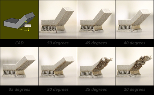 Most metal printers limit the angle of an unsupported overhanging feature—that is, the angle between the feature’s surface and the horizontal plane—to around 45 degrees. The supports required by lower-angle overhangs must be removed in an often laborious postprinting process.
